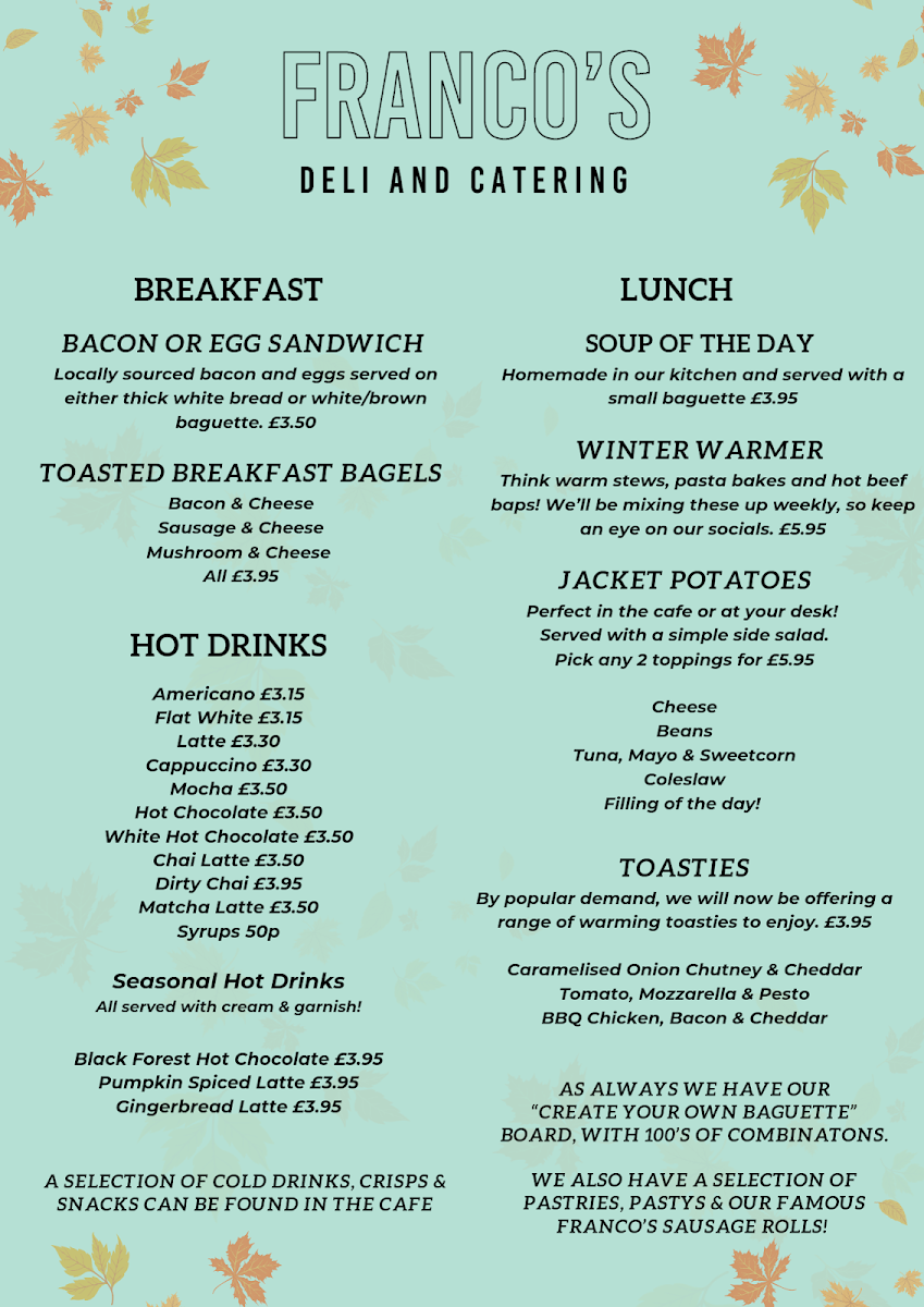 Welcome to Franco's Deli & Catering, a delightful cafe nestled in the heart of Greenways Business Park, Chippenham. Here, culinary passion meets a cozy atmosphere, making it the perfect destination for a quick coffee or a leisurely lunch.